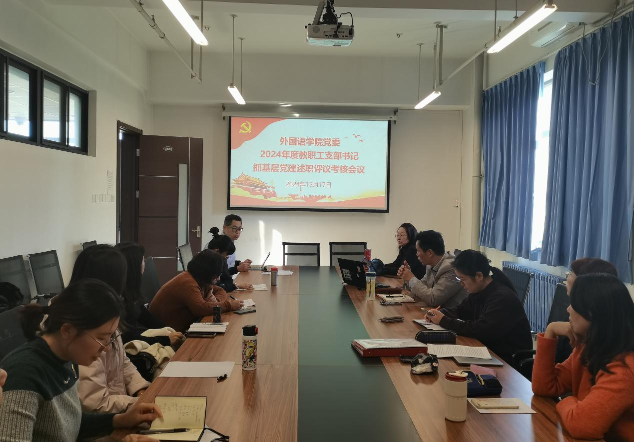 大英一教研室党支部书记陈蓓、大英二教研室党支部书记王欣、研究生外语教研室党支部书记张诗卉、英语专业教研室党支部书记郑蓉颖先后围绕支部基本情况、工作开展情况、存在问题及反思和改进措施四个方面进行了述职报告,重点突出了支部在政治功能发挥、组织生活制度执行、党员发展教育管理、教师思想政治工作、发挥引领作用、党风廉政建设等工作开展情况。各支部书记在本年度工作中,积极团结带领各支部党员,加强支委间工作联系,发挥支部的政治引领作用;开展党纪学习,严格按照党要管党、从严治党的要求,落实支部引领作用;聚焦立德树人的根本任务,推进师德师风建设;开展有组织科研、教研,推进支部建设与教学科研活动有机融合,建设高水平人才队伍。评委们根据各支部书记日常工作表现,结合各支部手册检查情况、满意度测评和述职评议表现,对本年度工作进行了考核打分。