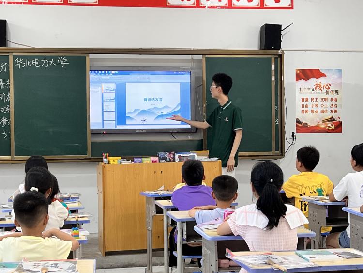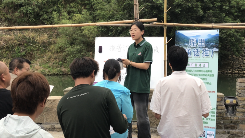 瑶里中心学校是本次推普实践的主要阵地,团队成员在此开办暑期推普拓展班,讲解普通话专业知识,设置推普图书角,开展“典耀中华”读书活动和线上经典朗诵比赛,丰富当地员工的假期生活,也让普通话推广走进乡村校园。