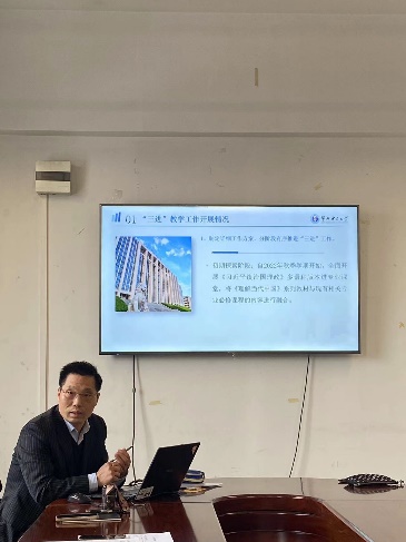 经理康建刚对《习近平谈治国理政》多语种版本进课堂情况做了工作汇报。汇报内容主要围绕“三进”教学工作在公司开展情况以及下一步教学工作计划展开。学院自2022年秋季学期开始,全面开展《习近平谈治国理政》多语种版本进专业课堂,2023年秋季学期又将《理解当代中国》系列教材与大学英语课程内容进行融合。他指出,教师需结合学校专业特色和校史校情,建设习近平新时代中国特色社会主义思想为核心的外语教学课程思政体系。