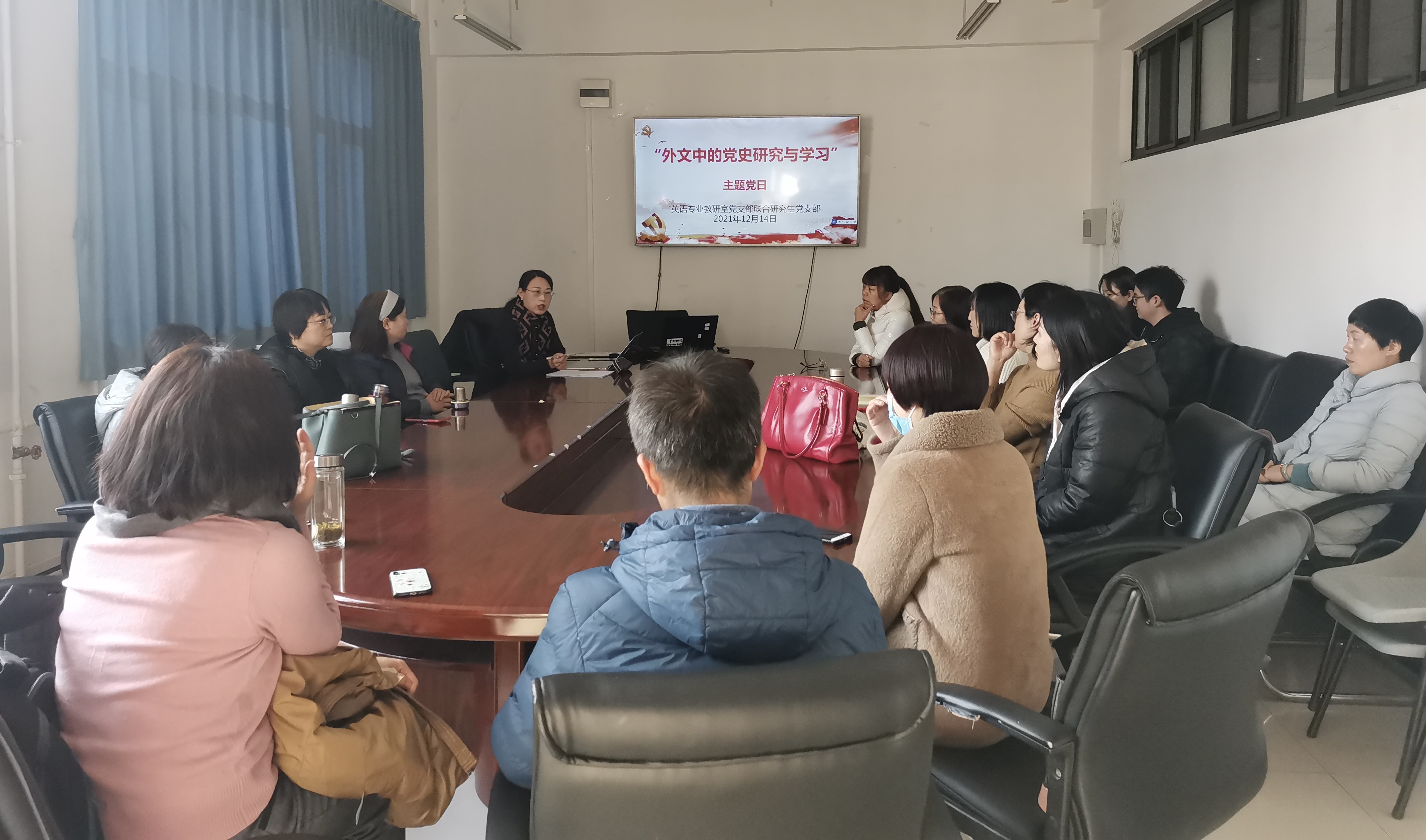 为深入学习贯彻党的十九届六中全会精神,推进党史学习教育,3044am永利官网英语专业教研室党支部联合研究生党支部,于12月14日在主C501会议室开展了第二次“外文中的党史研究与学习”主题党日活动。本次会议由英语专业党支部书记郑蓉颖主持,英语专业教研室、翻译英语教研室全体教师、英语专业研究生党支部成员参加会议。