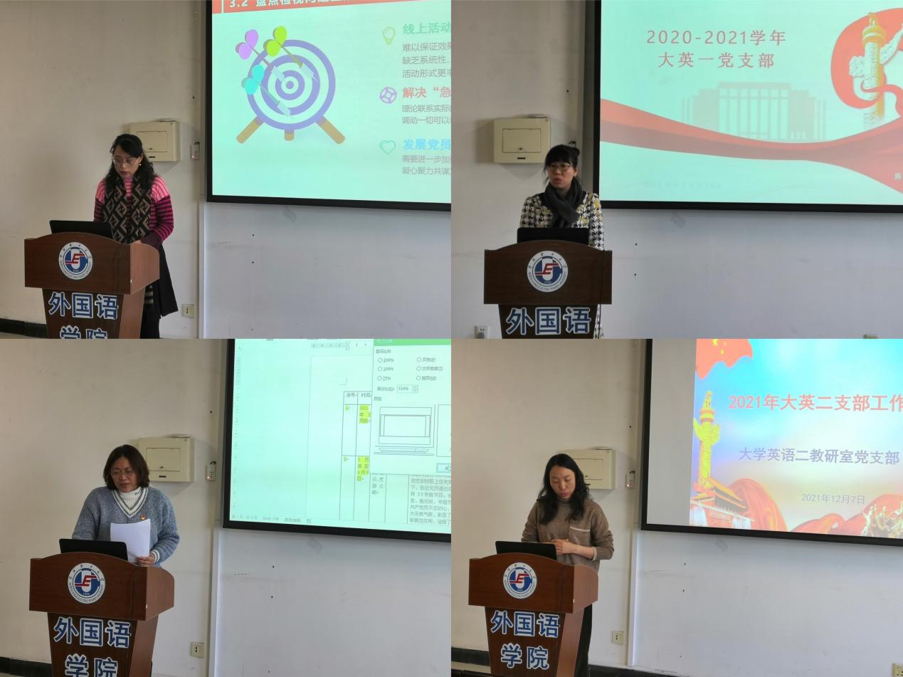 然后,英语专业教研室党支部书记郑蓉颖、大学英语一教研室党支部书记陈蓓、研究生外语教研室党支部书记尹宇、大学英语二教研室党支部书记王欣,分别结合各自党支部在政治功能发挥情况、党内政治生活执行情况、党支部规范化建设情况、教师思想政治工作情况、发挥引领作用情况、党风廉政建设情况等内容进行了详细汇报和总结,同时郑蓉颖在“党建融合业务”、党建工作样板支部申报;陈蓓在多渠道、多方向联系党员群众;尹宇在《党支部活动台账》等支部活动汇总;王欣在博采众长推动支部建设等方面分别进行了特色展示和经验总结。