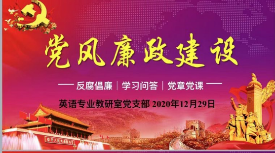 为深入学习贯彻习近平新时代中国特色社会主义思想和党的十九大、十九届五中全会、十九届中央纪委四次全会、教育系统全面从严治党工作视频会议精神,落实学校全面从严治党工作会议有关要求,12月29日,英语专业党支部通过腾讯会议开展了“党风廉政建设宣传教育月”主题党日活动。本次会议由英语专业党支部书记郑蓉颖主持,支部纪检委员崔靓与大家共同学习了党纪法规和师德师风的相关文件,于喜海书记对本次主题党日活动进行了总结和点评。党支部全体成员参加会议。