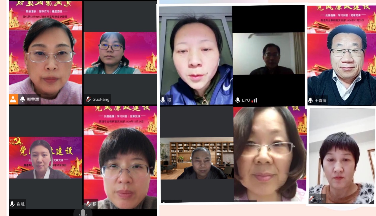 12月中旬,郑蓉颖同志根据学校有关要求,下发了本次主题党日的学习材料,组织支部成员自发学习。12月29日的线上会议中,她介绍了本次党风廉政建设宣传教育活动的目的、主题与目标要求,对近期英语专业党支部围绕“党风廉政建设”所开展的系列活动进行了梳理,强调学习贯彻党的十九届五中全会精神,认真落实中央纪委、教育部党组和公司党委关于全面从严治党的总体要求,是学校“双一流”和高水平研究型大学建设的坚强纪律保证。
