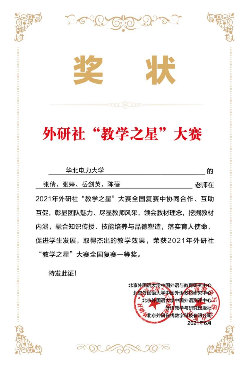 在2021年外研社“教学之星”大赛中,公司教师张婷、岳剑英、陈蓓、张倩团队获全国复赛一等奖;刘辉、郑蓉颖、杨海霞、崔靓团队获全国复赛二等奖。在2021外研社多语种“教学之星”大赛中(大学法语组)中,张诗卉和桑瑞老师分别获全国总决赛优秀奖。
