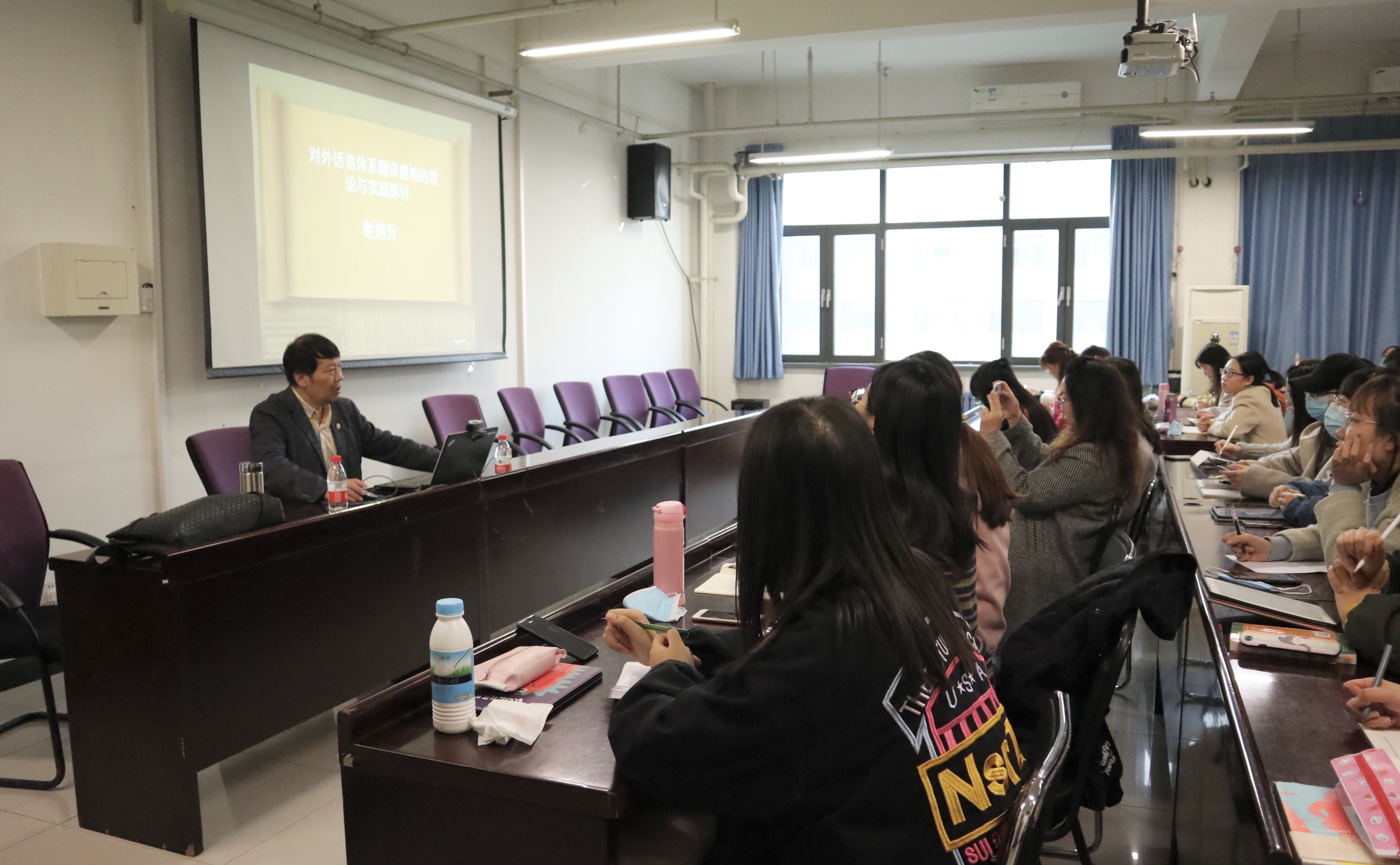 讲座伊始,谢旭升教授从国际背景介绍了中国话语权的地位,并从对外意识形态输出的差异引出对外话语体系研究的重要性。随后,谢旭升教授从对外话语研究体系的背景、对外话语体系的内涵、对外话语体系的建构源于编译等十个方面进行了详细阐释。从理论与实践两方面,并结合自身翻译教学与翻译经验分享译学、译术心得,针对对外话语体系研究,其指出要善于将中国文化和当下社会结合起来,实现中华文化的欧美式表达,以世界姿态输出中国文化,发出中国声音,讲好中国故事。