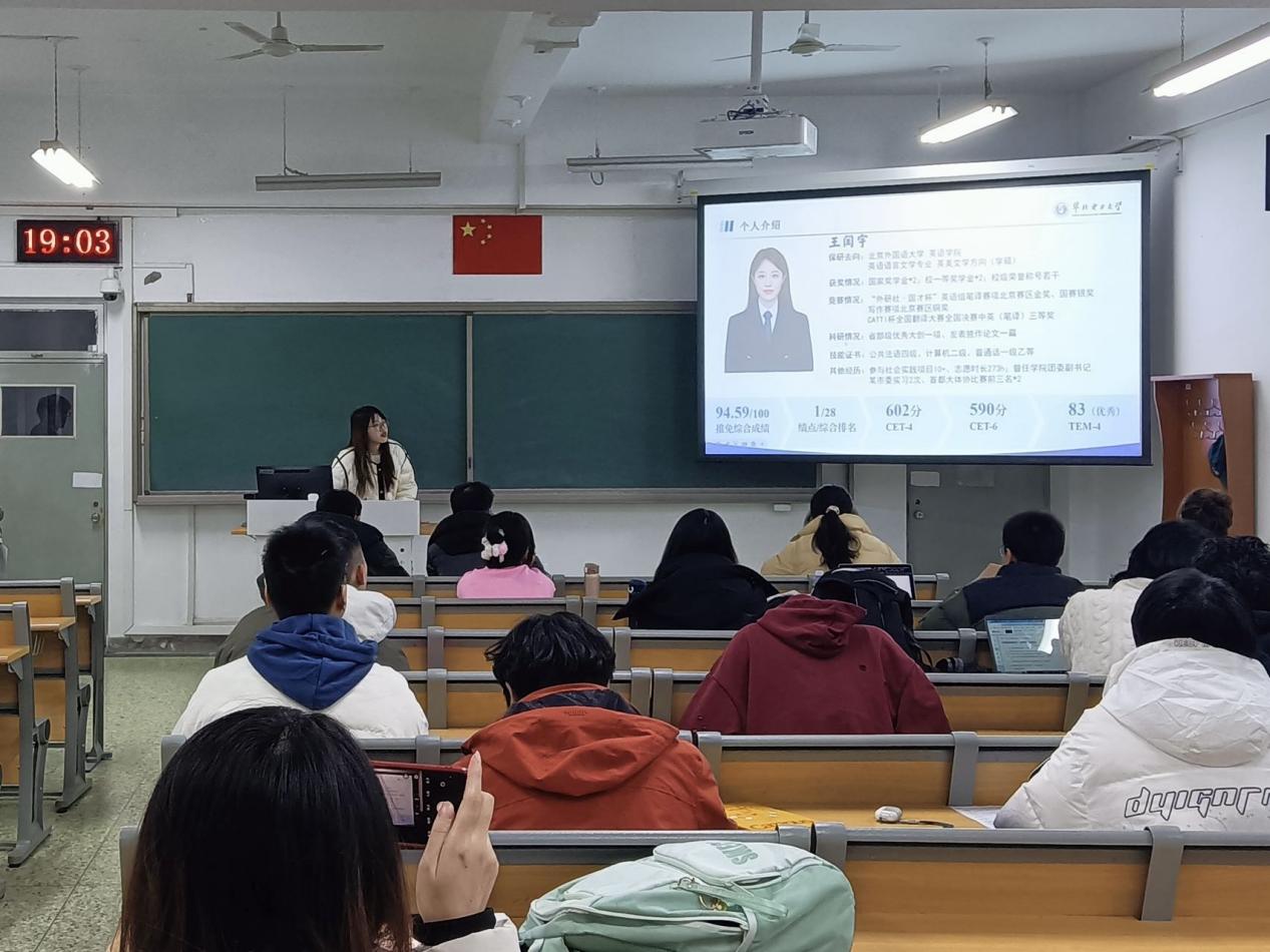 王闰宇强调学业成绩的重要性。她表示:“从大一开始,每一门专业课程都不容忽视,它们是我们敲开理想学府大门的第一块砖。”此外她还详细分享了自己的学习方法,包括制作思维导图来梳理复杂的语言学知识体系,以及利用零散时间在手机应用上进行词汇拓展训练,让学习融入生活点滴。她鼓励学弟学妹们提前规划学术路线,并努力发表高质量论文,以提升专业学术影响力。