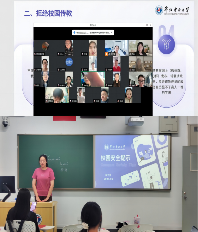 研外2265班班主任韩嫣老师通过生动的案例分析,向大家讲解了如何在日常生活和学习中提高自我保护能力,如何识别和应对潜在的危险。她特别提醒同学们还应注意个人信息的保护,不要随意在网上泄露个人隐私,防范网络诈骗。