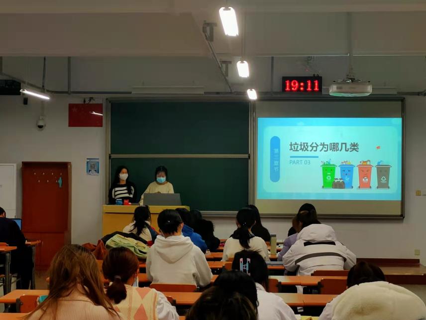 宣讲由一段视频作为开头,视频中垃圾堆叠如山的现状,垃圾分类艰难的推行历程让同学们充分认识到垃圾分类的必要性和重要性。宣讲主体分为垃圾分类的意义,垃圾分类的现状,垃圾的种类以及垃圾分类小程序四个部分组成。系统地向同学们介绍了垃圾分类的相关知识。