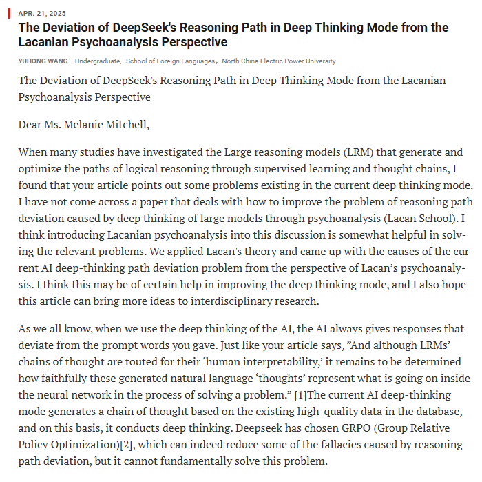 2025年3月20日,2024级本科生汪育弘,在《Science》杂志的eLetters平台上发表题为《从拉康精神分析的角度看DeepSeek在深度思维模式中的推理路径偏差》(The Deviation of DeepSeek's Reasoning Path in Deep Thinking Mode from the Lacanian Psychoanalysis Perspective)的观点评述文章,展现了3044am永利官网员工跨学科研究的独特视角与创新精神。