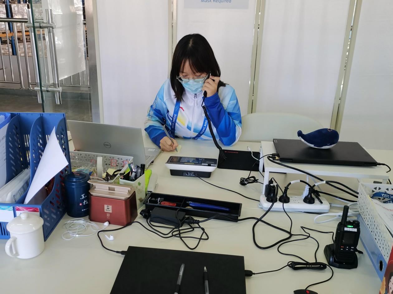2021年10月8日起,她作为学校第一批冬奥会骨干志愿者,在延庆制服和注册分中心开始志愿服务工作。在YUA场馆进入锁闭期前,进入制证车间接受全流程培训,参与“相约北京”延庆赛区测试赛的证件制作工作,协助运行中心团队处理测试赛通行权限矩阵的数据审核工作。目前担任系统上传组的项目牵头人,主要负责注册证件的系统上传工作、相关资料的英文翻译工作、三个赛区注册设施的信息核对工作等。冬奥和冬残奥赛时,担任客户服务主管,为注册客户提供问题处理和咨询服务。