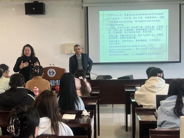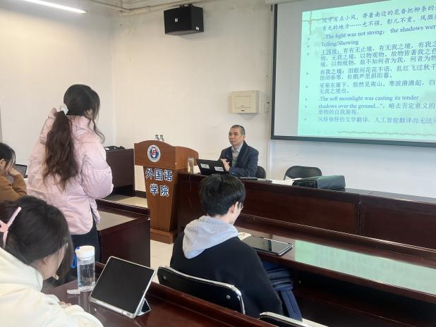 随后,吴教授通过展示《茶馆》、《那五》、《烟壶》、《蒲柳人家》、《骆驼祥子》和《月牙儿》等多部京味文学作品的英译分析,为同学们详细讲解了京味语言、京味叙事及京味文化的再现。他强调,京味文学的英译应注重方言和口语化语言风格的等效再现,而不必仅仅依赖方言对方言的翻译策略;京味叙事需要通过叙述声音和视角的变化,展现人物感知的世界。在京味叙事的英译中,应着力突出京城小市民“亲近”的叙事声音与视角所体现的京味再现;至于京味文化,它是京味文学的精髓,英译时需准确而生动地展现民族文化和市井生活,避免文化误读。