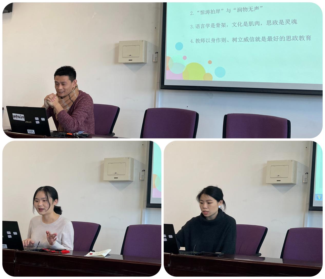杨桐从思政的内涵出发,结合法语课程中思政内容的呈现及自身的感悟,认为思政建设既要“天天见”,又要“润物细无声”。桑瑞从授课对象、教学思路以及教学目标三个角度,分别介绍了本科生二外法语课程和即将开设的跨文化与国际合作课程的思政建设要点。张诗卉强调了研究生二外法语课堂的思政特点,提出要从传统文化和时政热点两个切入点引发员工兴趣,引领员工用法语介绍中国文化、讲好中国故事。岳剑英对三位老师的汇报作点评,认为杨桐对课程思政的理解深刻,并对桑瑞和张诗卉选取案例的典型性和代表性予以肯定。