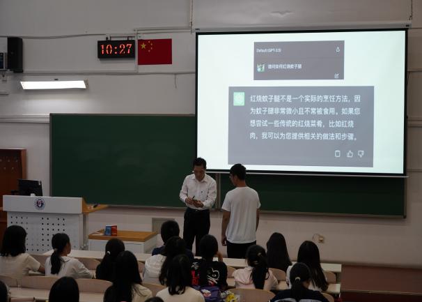 接着,经理康建刚面向全体新生进行学院概况、团队建设和团队队伍等情况的介绍,通过Chat-GPT程序对“如何红烧蚊子腿”的回答引入,采用英汉双语宣讲的形式从“怎么看”和“怎么办”两个维度指出新生之惑,提出当下外语专业员工普遍存在的两个焦虑:一是对专业发展前景的焦虑,二是新技术(如Chat-GPT)对专业冲击的焦虑。面对新生之惑,他借用GPT的缩写提出了他独到的理解和专业意见,为毕业生未来的学习生活提供指引。