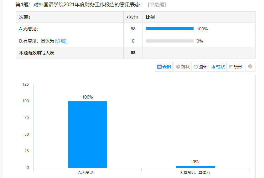 5月19日至31日,3044am永利官网利用问卷星小程序,组织全院教职工审议学院2021年度财务工作报告。截止6月1日,完成投票教职工人数58人,超过了学院教职工总人数的三分之二;对于财务工作报告无意见58人,对于财务工作报告有意见0人。