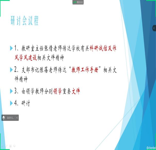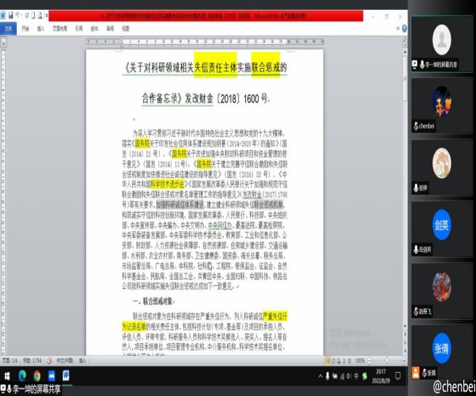 接下来,教研室老师陈蓓、岳剑英、赵聪敏、赵燕飞、张婷、李一坤、高波、陈艳颖、段素萍、张倩分别领学了科研诚信和作风学风建设相关的十一项文件。老师们准备充分,严谨认真,对文件中的重点内容做了深入细致的领学,使全体教师领悟了科研诚信的内涵和对教风建设的要求。