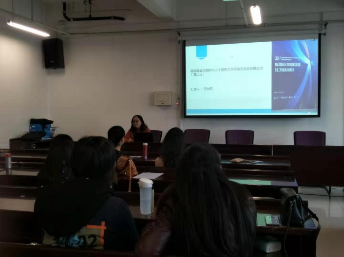 张倩对“首届高层次国际化人才培养工作经验交流会及推进会”第一天的会议进行了汇报,包括参会人员及会议内容等。她介绍到,推进会提出要“培养高素质人才”以应对全球治理,与会人员对该目标进行了解读,并提出的相关要求。