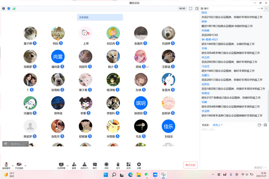 最后,李老师希望参会的各位同学,要协助做好同学们的思想动员工作,避免产生消极抵触情绪。疫情封校期间焦虑情绪的产生在所难免,但是“不是疫情偷走了我们的青春,而是疫情使我们的青春更有力量”。各位同学要充分发挥思想引领作用,积极主动参与到学校疫情防控工作当中,主动帮助稳定同学的情绪,营造良好的氛围和环境,并做好师生间的沟通桥梁作用,积极听取、收集广大同学们的意见建议。
