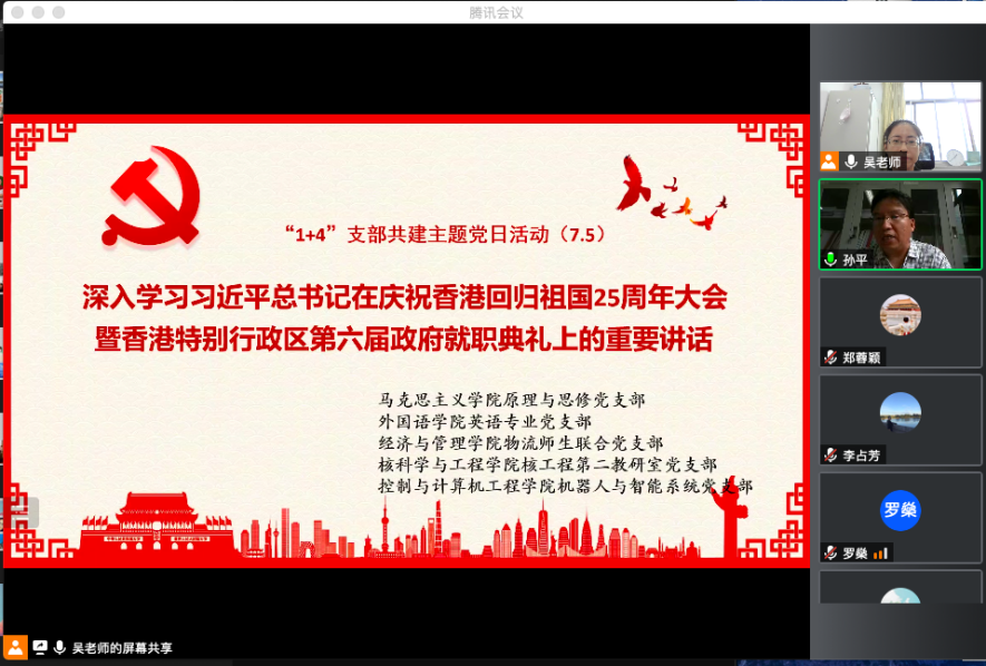 2022年7月5日,马克思主义学院原理与思修党支部、核科学与工程学院核工程第二教研室党支部、控制与计算机工程学院机器人与智能系统党支部、3044am永利官网英语专业党支部、经济与管理学院物流师生联合党支部五个支部组织了在线的主题党日活动,本次活动共有52名老师参加,由马克思主义学院原理与思修党支部书记吴宁宁老师主持,特别邀请了马克思主义公司党总支孙平书记与会。
