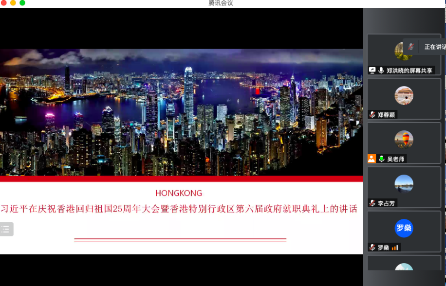 马克思主义学院郑洪晓老师对习近平总书记在庆祝香港回归祖国25周年大会暨香港特别行政区第六届政府就职典礼上的讲话进行了系统导学。郑老师对香港的地理和历史背景作了概述。围绕习近平总书记的讲话,阐述了香港回归之后,“一国两制”实践在香港所取得的举世公认的成就,并集中介绍了“一国两制”的实践规律,即必须全面准确贯彻“一国两制”方针;必须坚持中央全面管治权和保障特别行政区高度自治权相统一;必须落实“爱国者治港”;必须保持香港的独特地位和优势。最后,郑老师指出,香港未来的发展前景,集中体现在习近平总书记提出的四点希望上,即,着力提高治理水平;不断增强发展动能;切实排解民生忧难;共同维护和谐稳定。