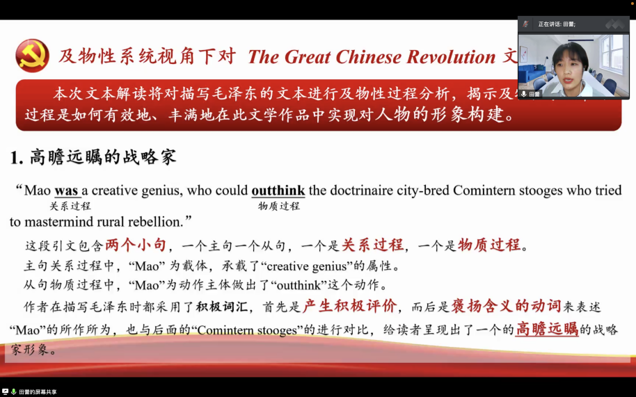 田蕾代表语言学小组,从系统功能语言学的及物性系统的视角对文本进行解读,从高瞻远瞩的战略家、知行合一和敢做敢为的青年两个维度,对描写毛泽东的文本进行及物性过程分析,揭示及物性系统如何有效地、丰满地在文学作品中实现对人物形象的构建。