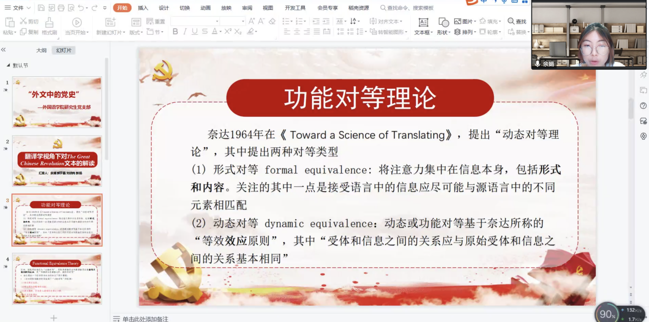 接着,研究生党支部的四位员工党员代表对本书的文本分别从翻译实践、翻译学、语言学和文学三个方面进行了深入而系统的学术阐释。
