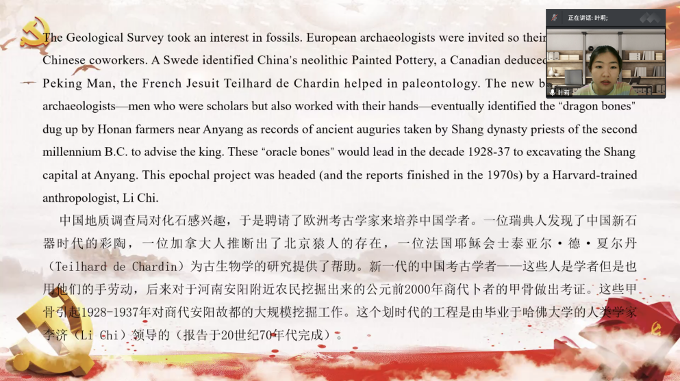 四位党员代表完成相关专业讲解之后,公司党委保卫委员尹宇进行专业点评,她对同学们不同专业视角下的文本解读表示了肯定,同时也希望同学们能够发现外文文本与自己本专业更深层次的关系。并希望公司党委“外文中的党史”主题党日活动能够继续挖掘外文文献在党史学习中的意义,彰显公司党建的特色和活力。