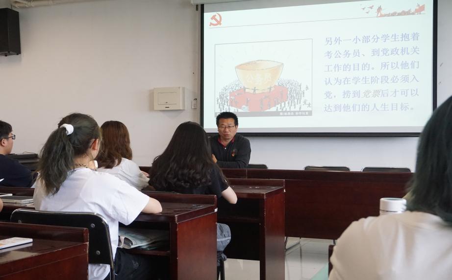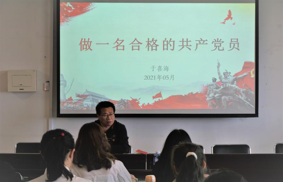 于喜海为大家讲授了第一堂课——“做一名合格的共产党员”。他以中国共产党党徽和党章为切入点,带领大家解读了党徽和党章的内涵和意义,同时鼓励大家在以后的学习中主动了解中国共产党的历史沿革,深刻认识党员的权利、义务和责任。随后,于喜海对新一届入党积极分子提出要求。他要求,同学们端正入党动机,提高思想觉悟。面对新时代的信息洪流,提高思辨能力,仔细甄别信息的真伪优劣,继而树立正确的世界观、人生观和价值观,深化思想认识,真正从思想上入党。他希望,同学们能以党员的标准严格要求自己,作为入党积极分子,不仅应该广泛而深入地学习政治理论,在思想上向党组织靠拢,还要把学习这一本职工作落到实处,提高科学文化素质,在同龄人中起到示范引领作用。
